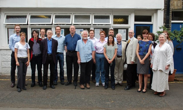 The EES staff, Trustees and Field Directors outside the Society’s offices on Doughty Mews in 2012. George is seventh from right in a light-coloured suit and blue-striped shirt.