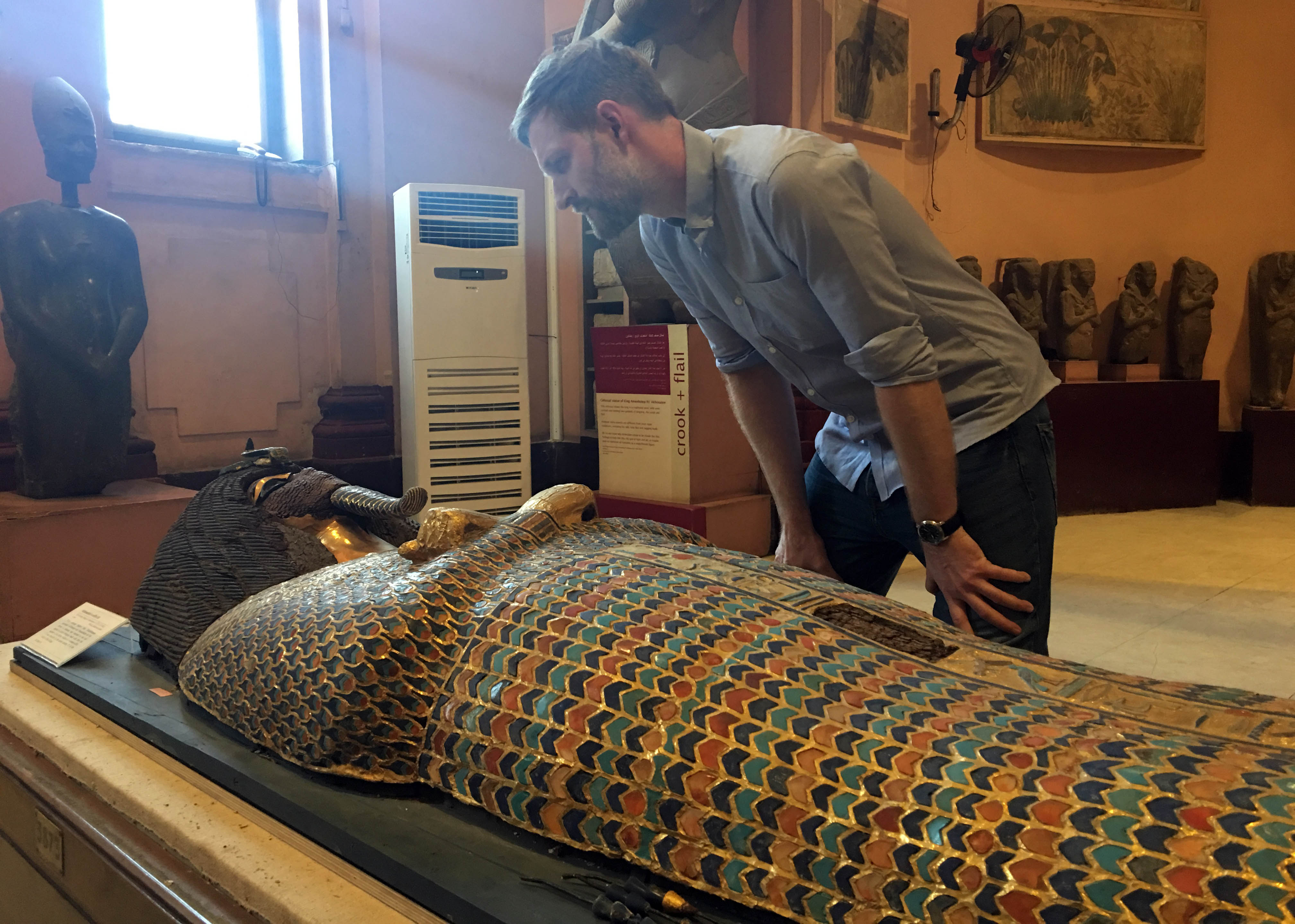 Me and the coffin from KV 55 in the Egyptian Museum, with the case removed for the making of a documentary in 2017.