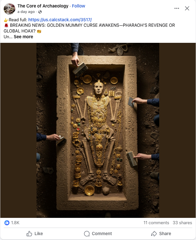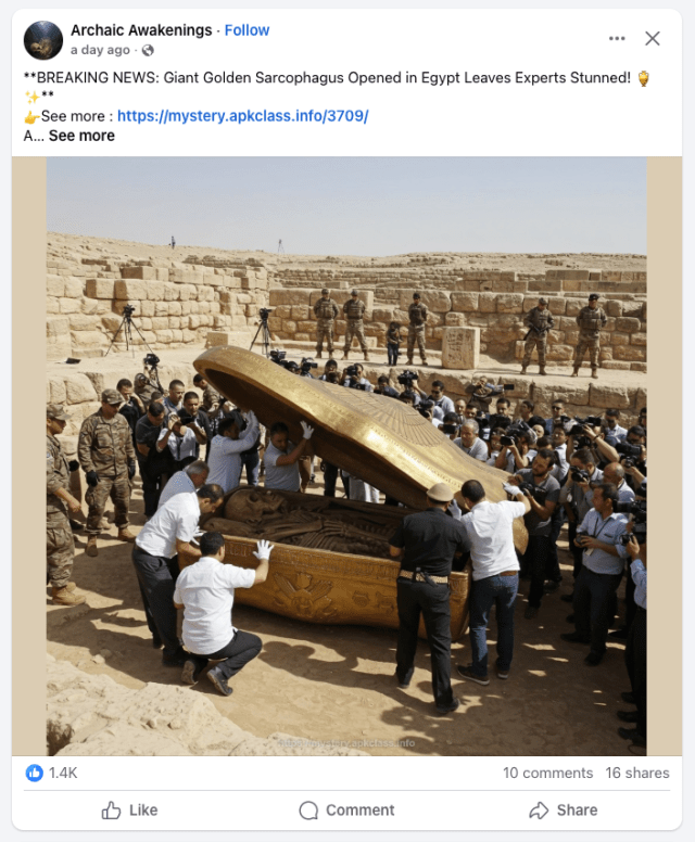 Perhaps worst of all, it seems that Egyptology-related content on social media platforms – which as we all know have enormous reach – are gradually being over taken by fictional stories of discovery accompanied by artificial images generated by AI, but which purport to be genuine. I have already had to set the record straight once or two in response to questions from Egyptophiles about such ‘discoveries; but there is now way any of us will be able to keep up with the slew of ‘slop’ now appearing on Facebook in particular. Handily for me, I began to see this trend reported , with appropriate concern, in the traditional media as I was preparing my talk, and again I included a few quotes in my presentation.