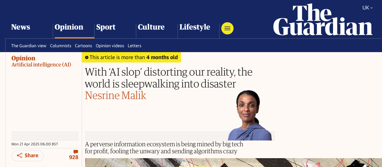 3. Malik, N, ‘With ‘AI slop’ distorting our reality, the world is sleepwalking into disaster’ The Guardian, 21 April, 2025