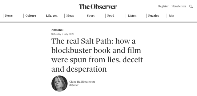 2. Hadjimatheou, C, ‘The real Salt Path: how a blockbuster book and film were spun from lies, deceit and desperation’ The Observer, 5 July, 2025.