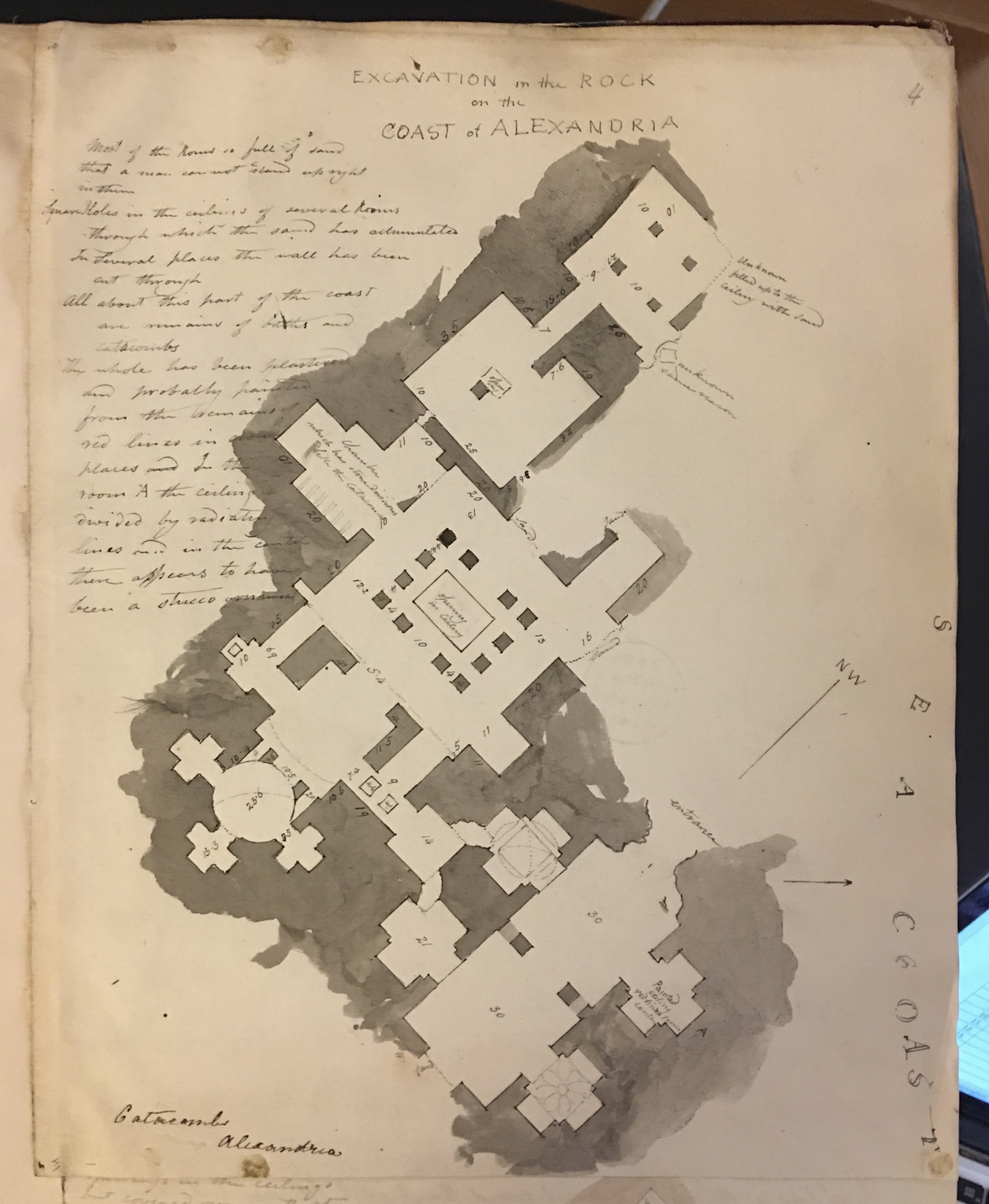 Burton’s archive in fact included two versions of the same plan (add ms 25634 f.4 and f. 5), one – the more finished looking of the two – with the heading ‘EXCAVATION in the ROCK on the COAST of ALEXANDRIA’, both annotated with the phrase ‘(The) Catacombs Alexandria’. To this Burton had added the following note: