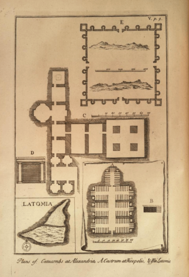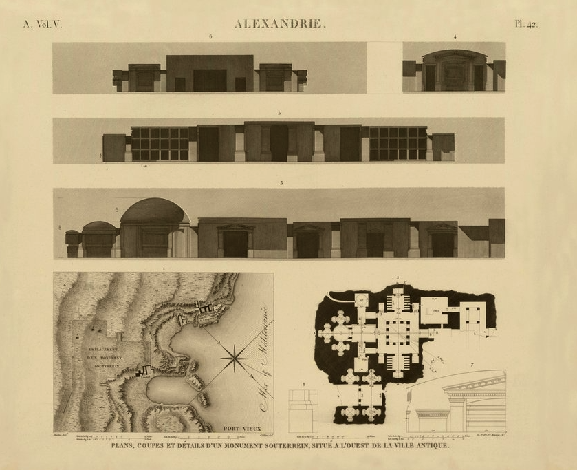 The ‘baths’ were apparently somewhere in Alexandria and they appeared in drawings made by several of the individuals who appear in my book, including James Burton, Pascal Coste, and Hector Horeau. Burton and Coste had drawn plans of this monument, which appeared to comprise an elaborate series of chambers cut into the bedrock a short distance from the coastline, the largest incorporating a number of square-based pillars and opening, via a smaller, rectangular room, onto a circular chamber with smaller rooms, each identical in plan, leading off to the left, right and straight ahead. Large rock-cut monuments in Egypt are very often tombs and as I have an interest in the ‘lost tombs’ of Alexander the Great and Cleopatra – both of which were in Alexandria – I was keen to know more.