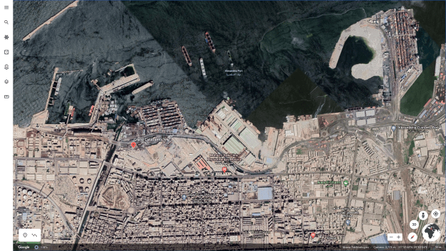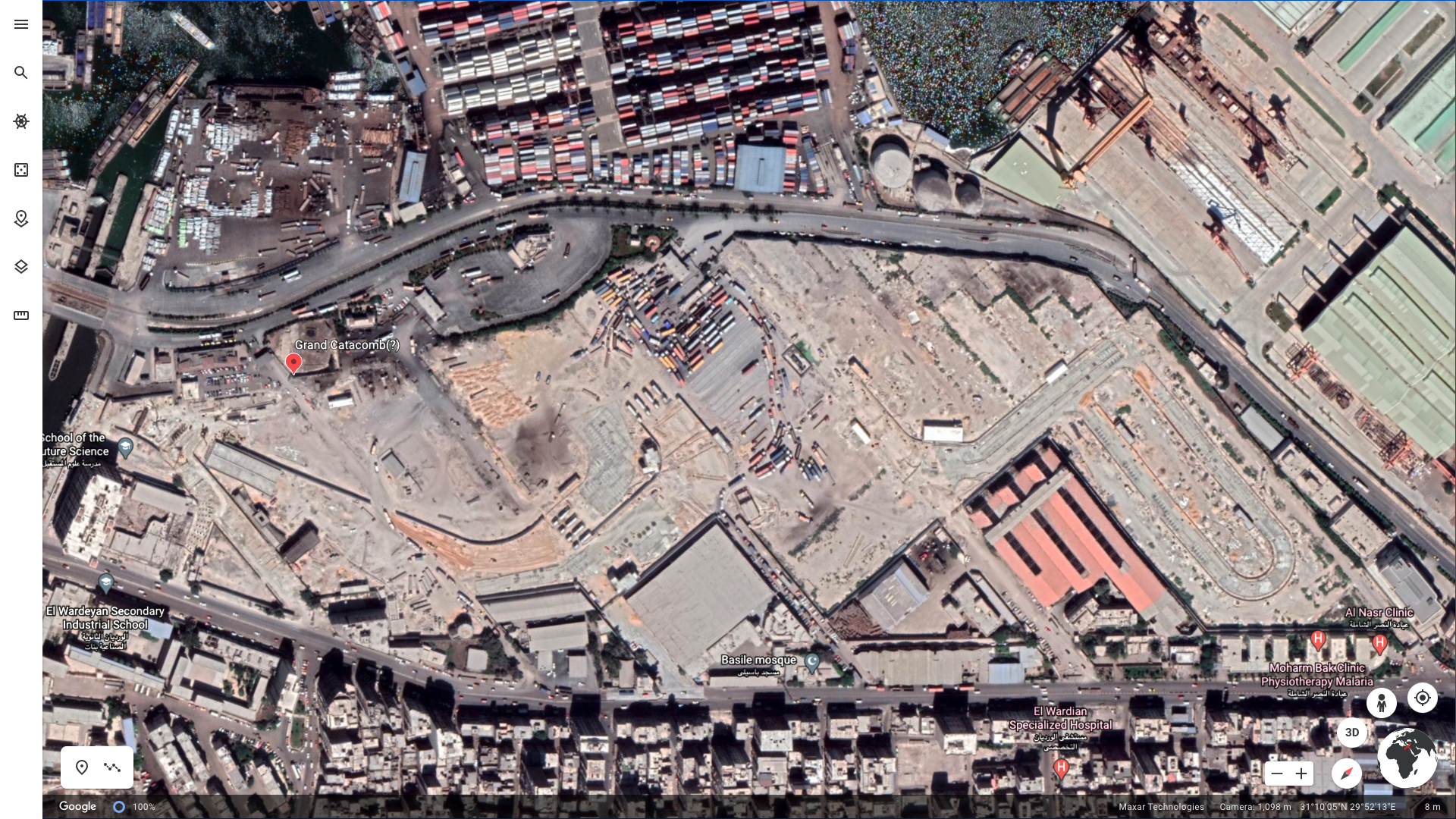 Satellite image from Google Earth showing the same part of Alexandria, with the probable location of the Grand Catacomb marked with a red pin.