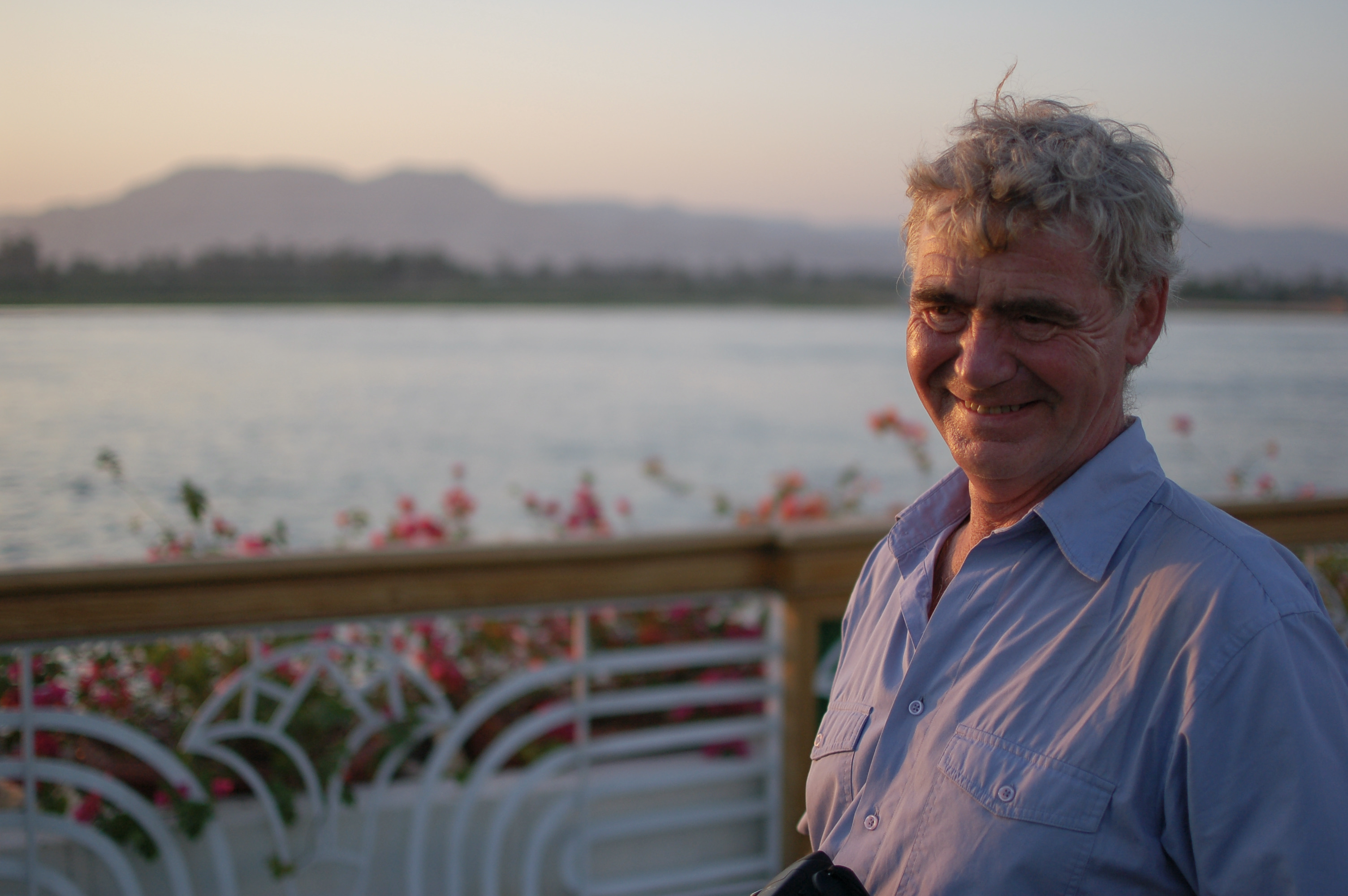 Steve by the Nile at sundown in 2012, with the Theban mountains across the other side of the river in the distance.