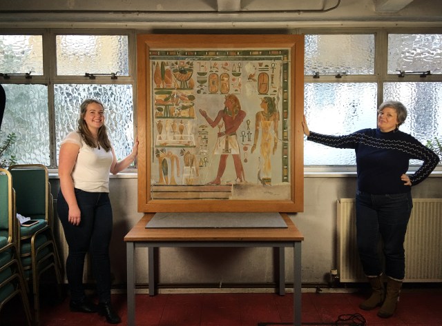 Dr Stephanie Boonstra (L) of the Egypt Exploration Society and picture researcher Sally Nicholls with Howard Carter’s painting of a scene from the Temple of Hatsheput at Deir el-Bahri which features in the book.