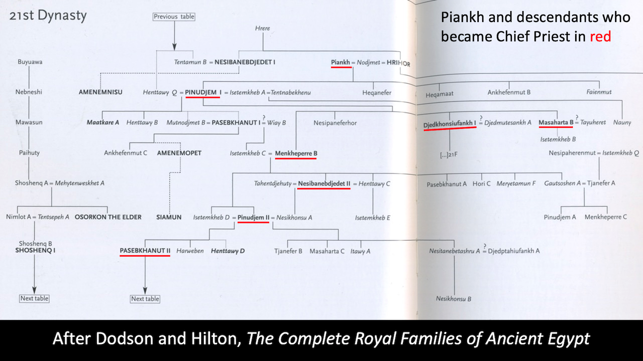 The historical setting for this talk is the Twenty-first Dynasty. The major study of the Third Intermediate Period, of which the Twenty-first Dynasty is the first part, remains Kenneth Kitchen’s, The Third Intermediate Period in Egypt, 1100-650 BC, a revised edition of which was published in 1986 (and a new preface was added to reprints from 1996 onwards). This is a masterful synthesis of the mass of confused and confusing evidence and remains indispensable for this reason. Much has been written since however, and some aspects of his reconstruction of the period are now out of date.