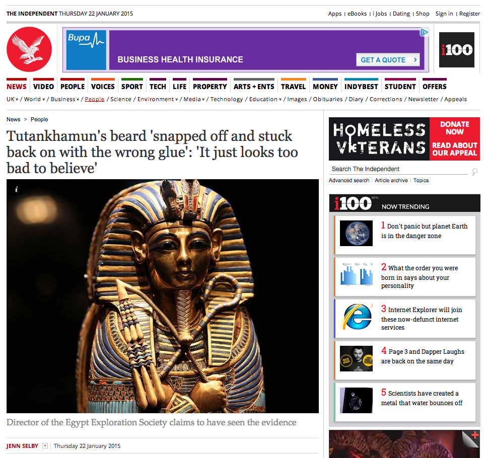I was very grateful to journalist Patrick Kingsley for making sure I was happy with the wording of the quote he would use for a piece inThe Guardian (‘Tutankhamun’s beard glued back on, say Egyptian museum conservators‘) and very unhappy with The Independent for borrowing Patrick’s work and conjuring up the fiction that ‘Director of the Egypt Exploration Society claims to have seen the evidence’: