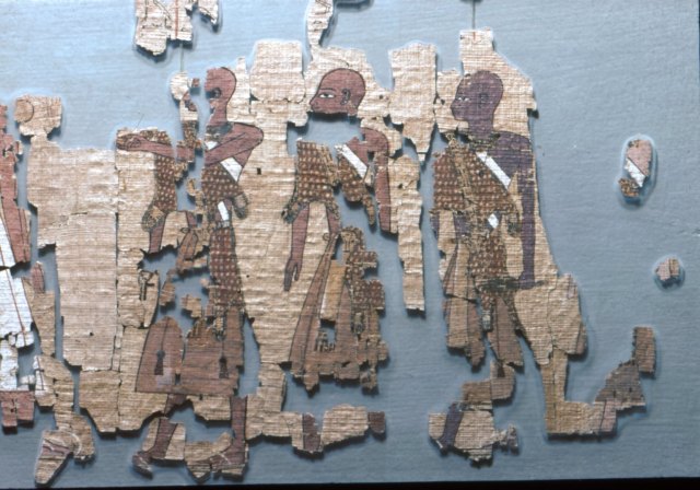 Fragment of the vignette of the ‘Saite Oracle Papyrus’ with Montuemhat at left, his son Nesptah (B) in the centre, and the chief Priest of Amun, Harkhebi, grandson of the Kushite pharaoh, Shabaqo, at right.