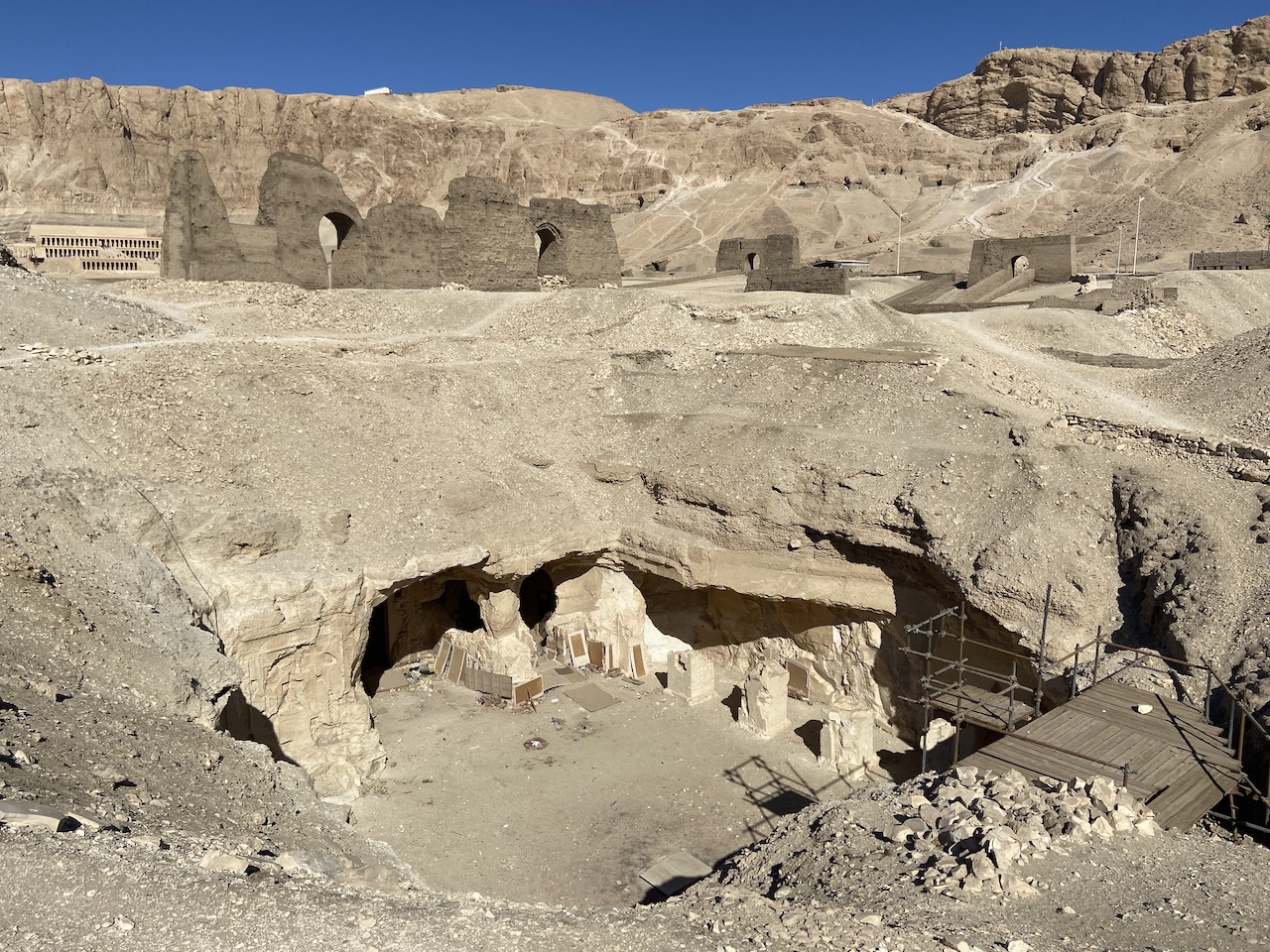 General view of the Asasif with the ‘lichthof’ of TT 37 in the foreground and the larger mudbrick pylon of TT 34 at top left.