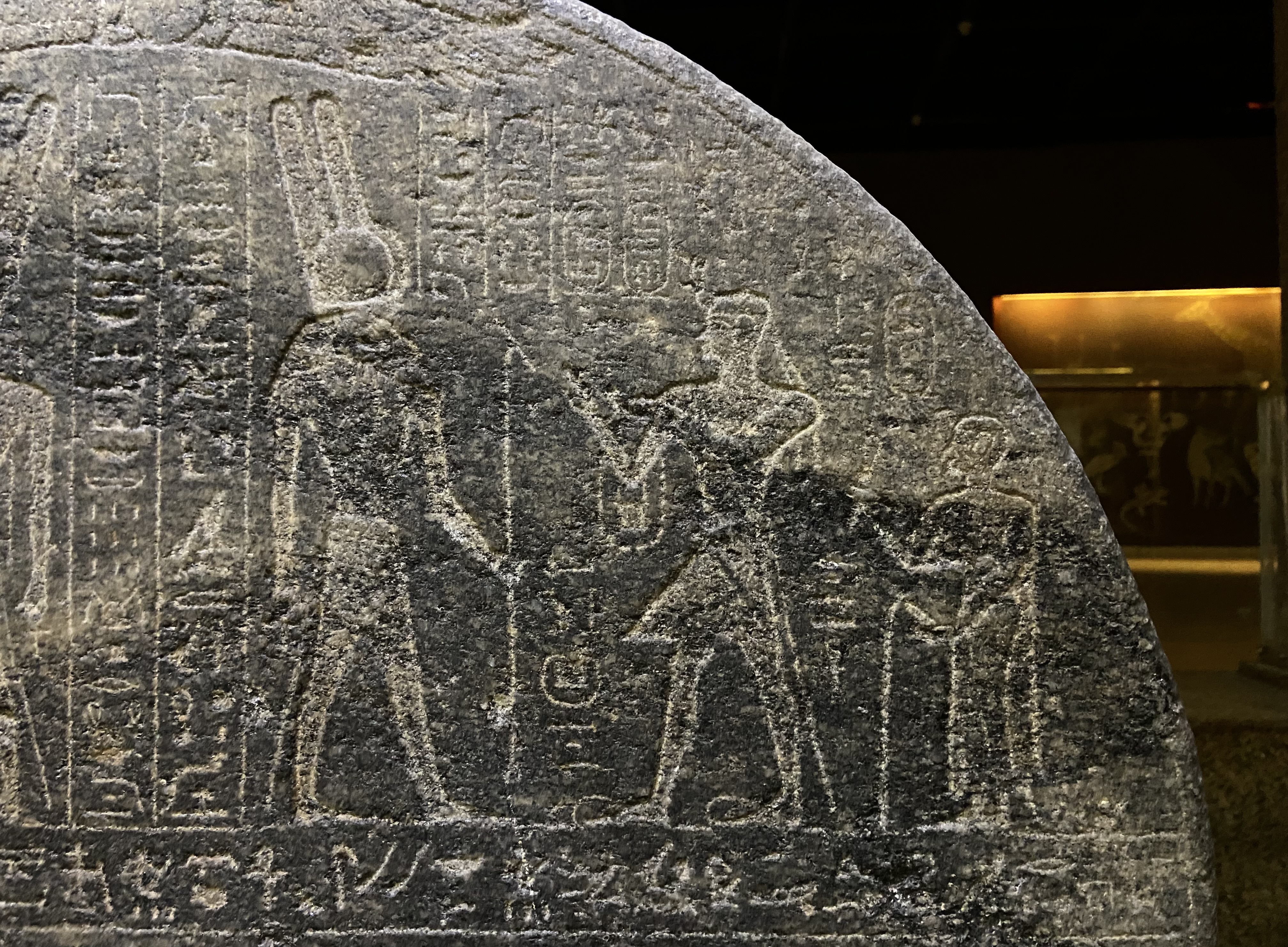 The ‘Dream Stela’ of Tantamani in the Nubia Museum, Aswan. Tantamani (in the middle) stands before ram-headed Amun of Gebel Barkal with his queen, Qalhata, behind him.