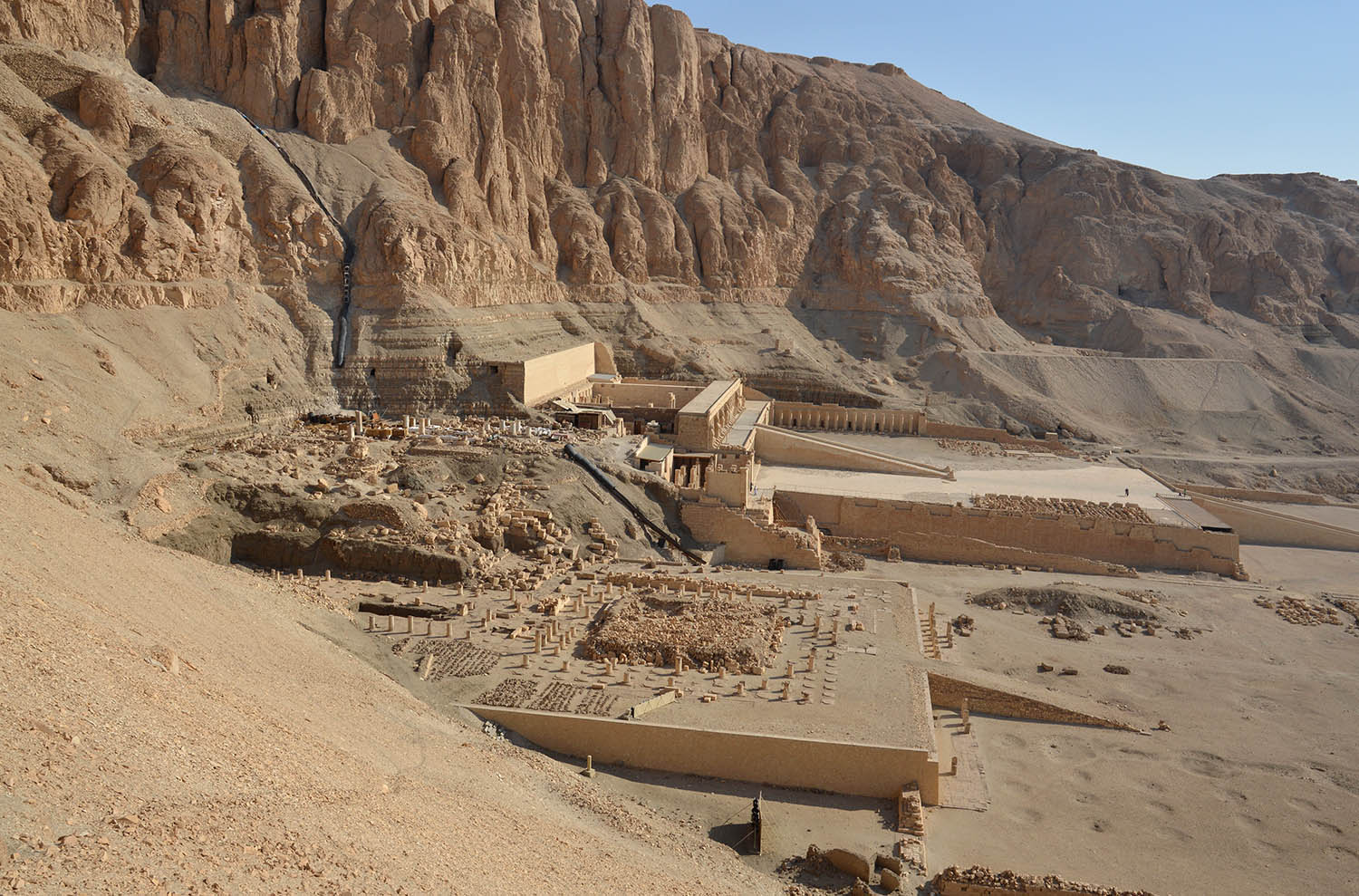 Deir el-Bahri, looking approximately north from the route up to TT 320, looking out across the temples of Mentuhotep II (foreground) and Hatshepsut (beyond).