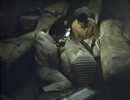A scene from ‘The Night of Counting the Years’ in which Ahmed Kamal (left) and a colleague inspect the coffins as found in TT 320