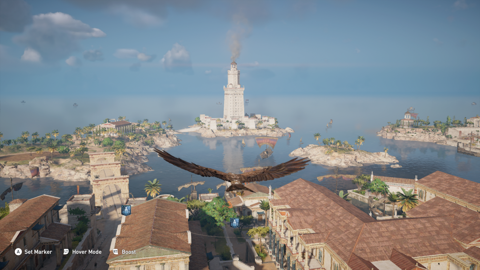 A view out across the Great Harbour towards the lighthouse on the island of Pharos, as it appears in Assassins Creed: Origins.