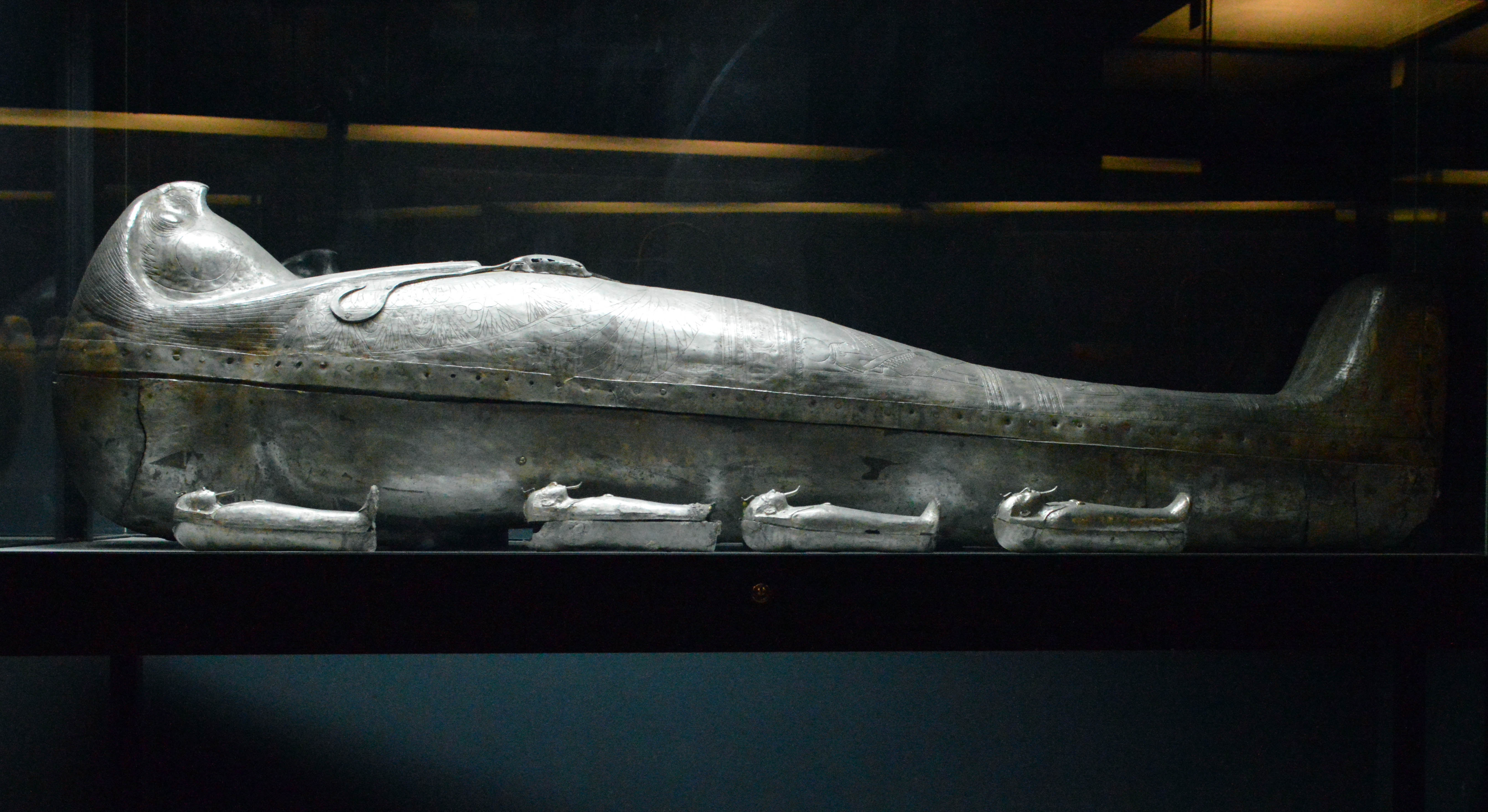 The solid silver coffin of Pharaoh Hedjkheperre Sheshonq IIa of the Twenty-second Dynasty, discovered by Montet at Tanis